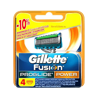 تیغ یدک فیوژن پروگلاید پاور حاوی ۴ عدد تیغ یدک در بسته بنده خود بوده و دارای درپوش محافظ برای جلوگیری از آلوده شدن تیغ های یدک می باشد. همچنین این تیغ یدک ژیلت دارای دو نوار ژلی در قسمت بالایی و پایینی تیغه ها است که در اثر برخورد با آب حالت لیز و سر پیدا کرده و پوست را هم سر می کنند که این امر در سرعت اصلاح و همچنین اصلاحی ایمن و دقیق تاثیر زیادی می گذارد.