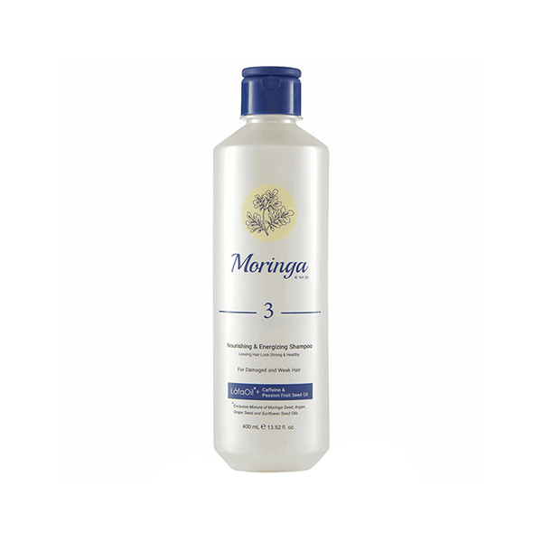 شامپو مغذی و انرژی بخش مورینگا امو کد 3 مخصوص موهای آسیب دیده و ضعیف حجم 400 میلی لیتر