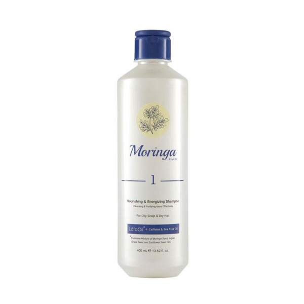 شامپو مغذی و انرژی بخش مورینگا امو 1 پوست سر چرب و موی خشک حجم 400 میلی لیتر