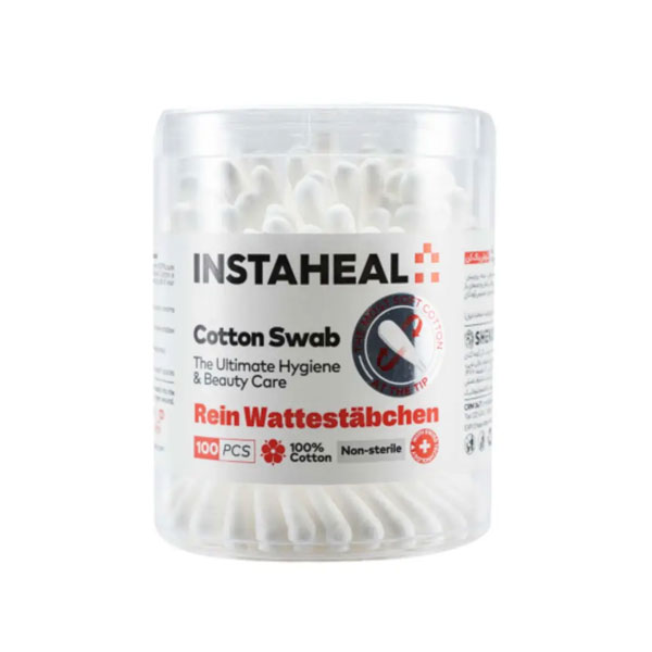 گوش پاک کن استوانه ای اینستاهیل 100 عددی تهیه شده از پنبه 100 درصد هیدروفیل ضدحساسیت و دارای دسته های قابل انعطاف می باشد.