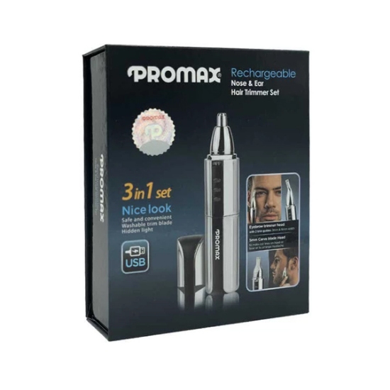 موزن گوش و بینی و خط زن پرومکس مدل 3414U یک دستگاه کاربردی برای اصلاح موهای زائد گوش، بینی، ابرو و خط ریش است. این دستگاه دارای سه سری قابل تعویض است که شامل سری موزن گوش و بینی، سری اصلاح ابرو، و سری خط زن ریش می‌باشد. سری موزن گوش و بینی به صورت چرخشی عمل می‌کند و برای کوتاه کردن موهای این نواحی طراحی شده است این دستگاه دارای باتری قابل شارژ است که با ۸ ساعت شارژ، ۴۵ دقیقه قابل استفاده است. همچنین، دارای چراغ LED برای دید بهتر و قابلیت شستشوی تیغه‌ها می‌باشد.