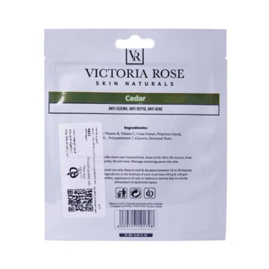 ماسک ورقه ای صورت سدر ویکتوریا رز دارای عصاره سدر، ویتامین‌های E، C، B و گلیسرین است. این ترکیبات موجود در این محصول موجب رطوبت رسانی ضد عفونی کنندگی شده و از جوش و اگزمای پوست جلوگیری می کند،  ماسک پارچه ای ویکتوریا رز به گونه‌ای فرموله شده که آقایان و بانوان با هر نوع پوستی می‌توانند از این محصول استفاده نمایند. این محصول با لایه برداری ملایم صورت به پاکسازی عمیق پوست و کاهش چین و چروک کمک می‌کند. همچنین به واسطه دارا بودن سدر باعث سم زدایی و پاک نمودن آلودگی‌ها می‌شود. ماسک صورت ویکتوریا رز حاوی عصاره سدر یک گزینه فوق العاده به جهت حفظ آب در سلول‌های پوستی است. در نتیجه اگر پوست خشکی دارید و به آبرسانی نیازمند هستید خرید ماسک صورت معرفی شده به شدت برای شما مناسب است.