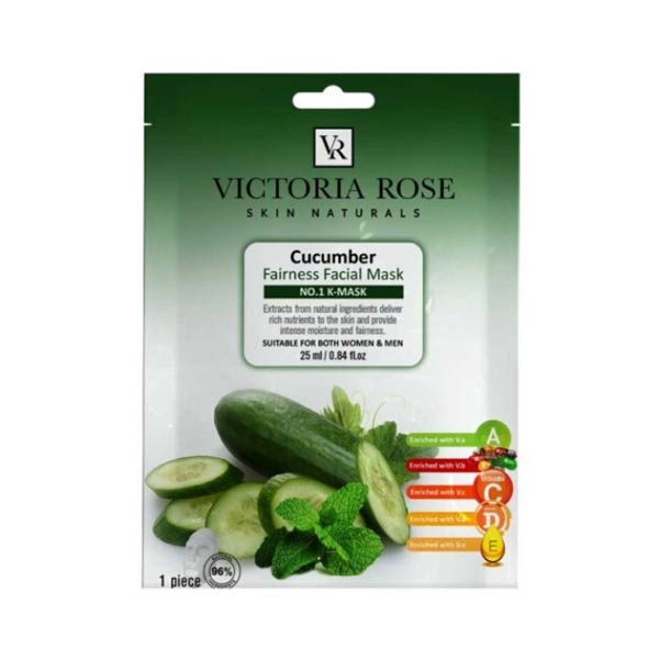 ماسک ورقه‌ای خیار و نعنا ویکتوریا رز حاوی ویتامین‌های آ، b، Cو D است. ترکیبات این ماسک دارای اثر کلاژن سازی و سفت کنندگی پوست هستند. به همین خاطر استفاده مداوم از این ماسک اثرات فوق‌العاده‌ای را بر روی زیبایی شما می‌گذارد.
