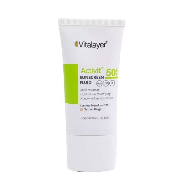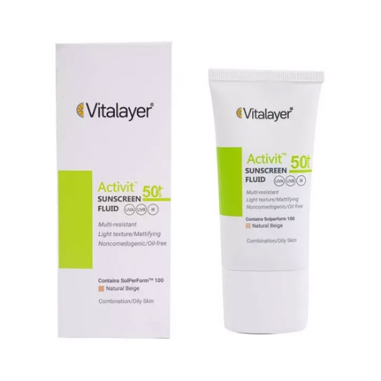 فلوئید ضد آفتاب ویتالیر مدل اکتیویت نچرال بژ محصولی مناسب برای انواع پوست به ویژه پوست‌های مختلط، چرب و دارای جوش است. این فلوئید ضد آفتاب ضمن جلوگیری از ایجاد جوش به درمان جوش و تنظیم ترشح چربی پوست شما کمک می‌کند. این محصول کاملا فاقد چربی بوده و خیلی زود جذب پوست می‌شود.